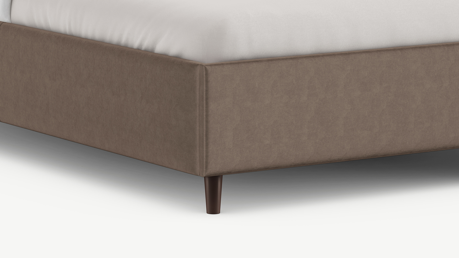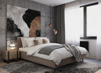 Царга, задающая пропорции, благодаря гладкости своей фактуры подчеркивает центральный элемент декора. Высокие опоры приподнимают фигуру кровати над полом и добавляют её образу визуальной легкости.