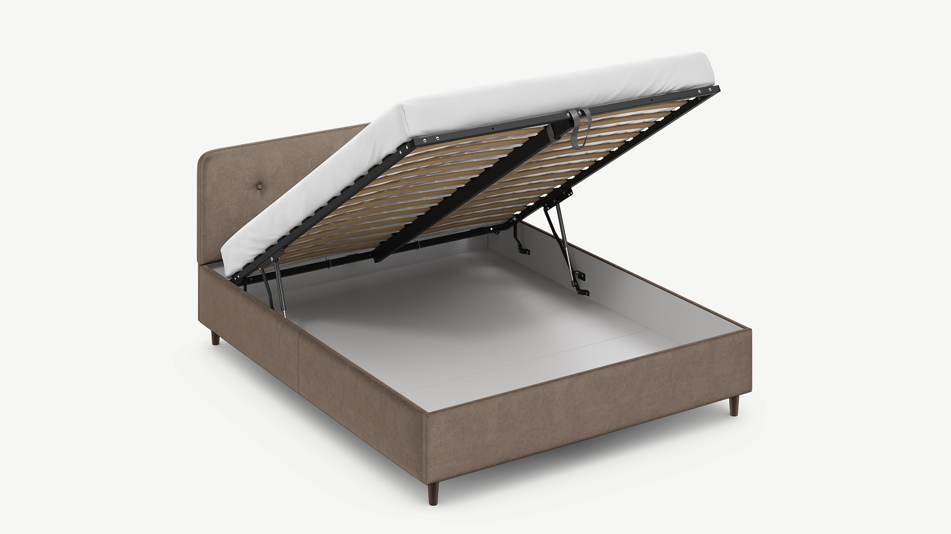 • Регулируемый подъемный механизм имеет два положения установки газовых амортизаторов в зависимости от веса матраса. Это дает возможность оптимально подстраивать угол подъема основания, а также плавно и бесшумно поднимать и опускать спальное место.