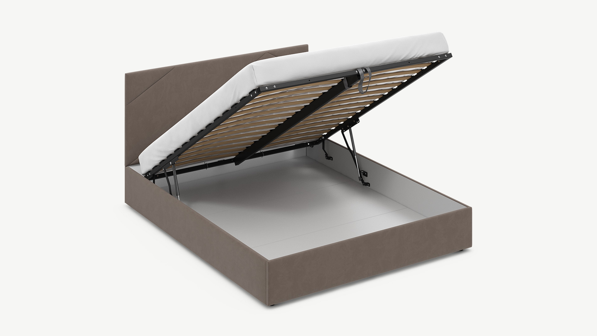 • Регулируемый подъемный механизм имеет два положения установки газовых амортизаторов в зависимости от веса матраса. Это дает возможность оптимально подстраивать угол подъема основания, а также плавно и бесшумно поднимать и опускать спальное место.