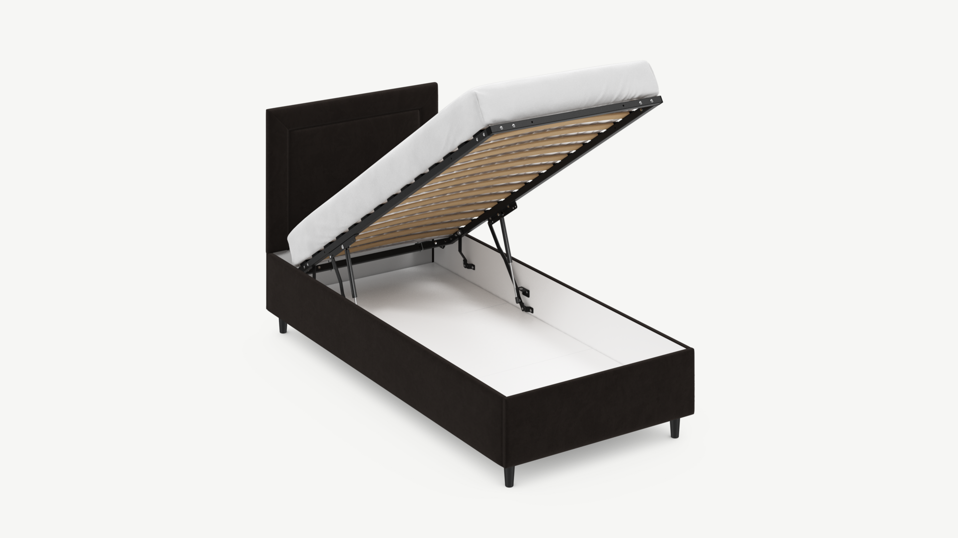 • Скрытая под основанием вместительная емкость без внутренних перегородок позволяет использовать всю площадь подкроватного пространства для хранения вещей.