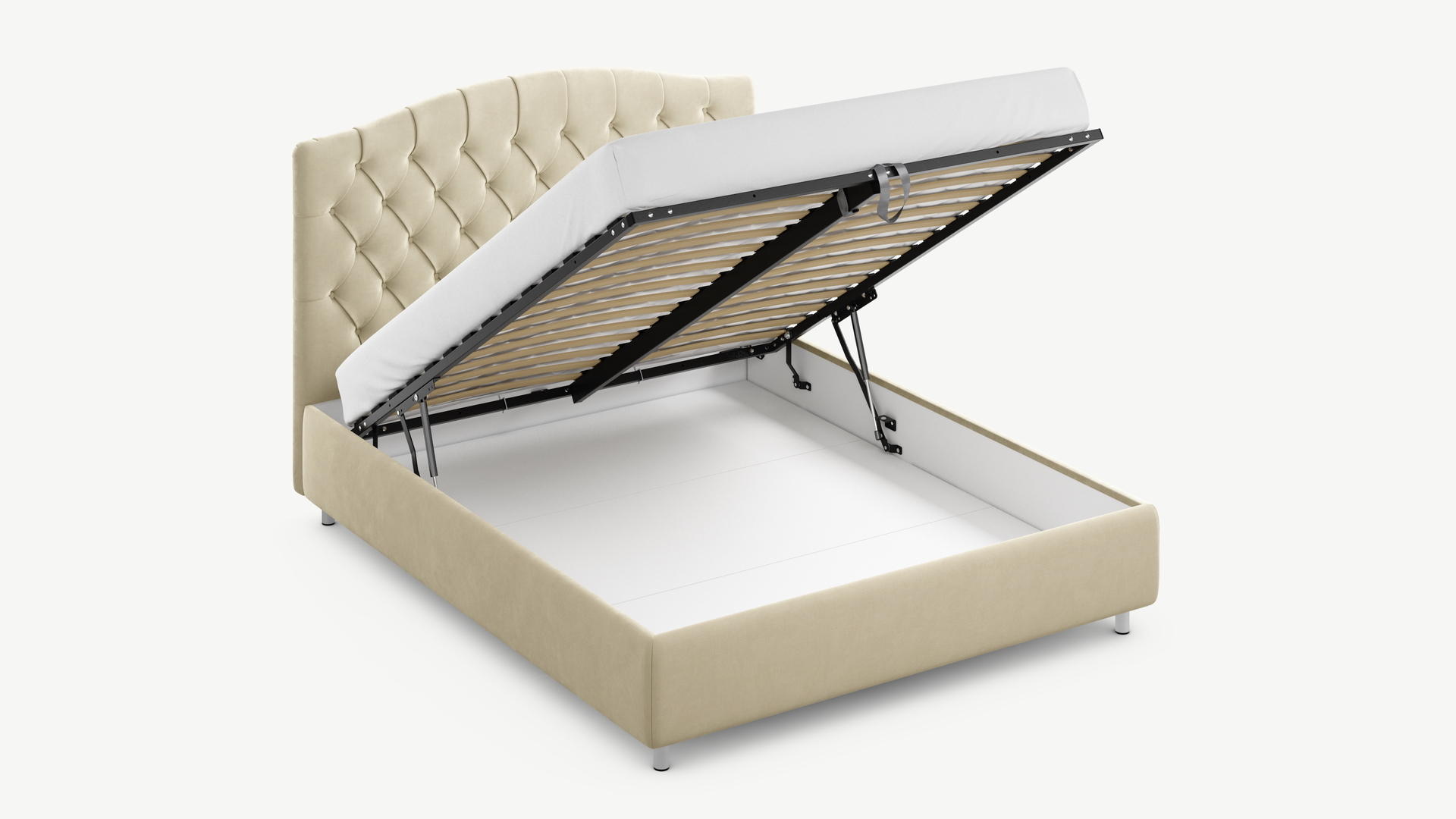 • Скрытая под основанием вместительная емкость без внутренних перегородок позволяет использовать всю площадь подкроватного пространства для хранения вещей.