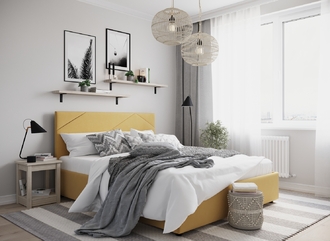 MOON FAMILY 1257 привлекает внимание оригинальным исполнением: широкие полосы ткани эффектно пересекают периметр изголовья, создавая на нем графический орнамент. Элегантным и практичным акцентом служат скрытые карманы, расположенные по его углам. Лаконичные формы объемных царг создают единый гармоничный образ и фокусируют внимание на центральном текстурном элементе кровати.