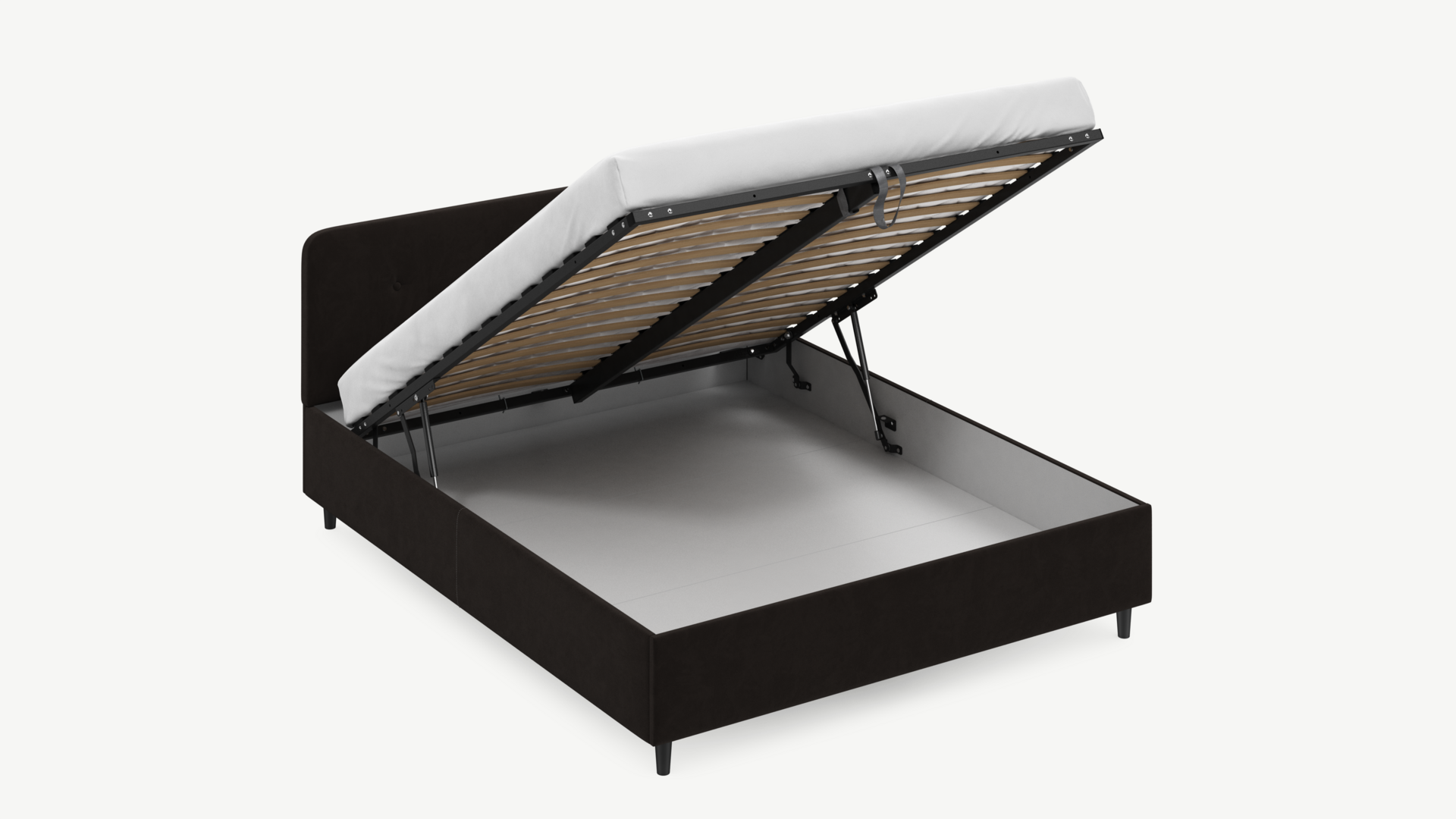 • Скрытая под основанием вместительная емкость без внутренних перегородок позволяет использовать всю площадь подкроватного пространства для хранения вещей.