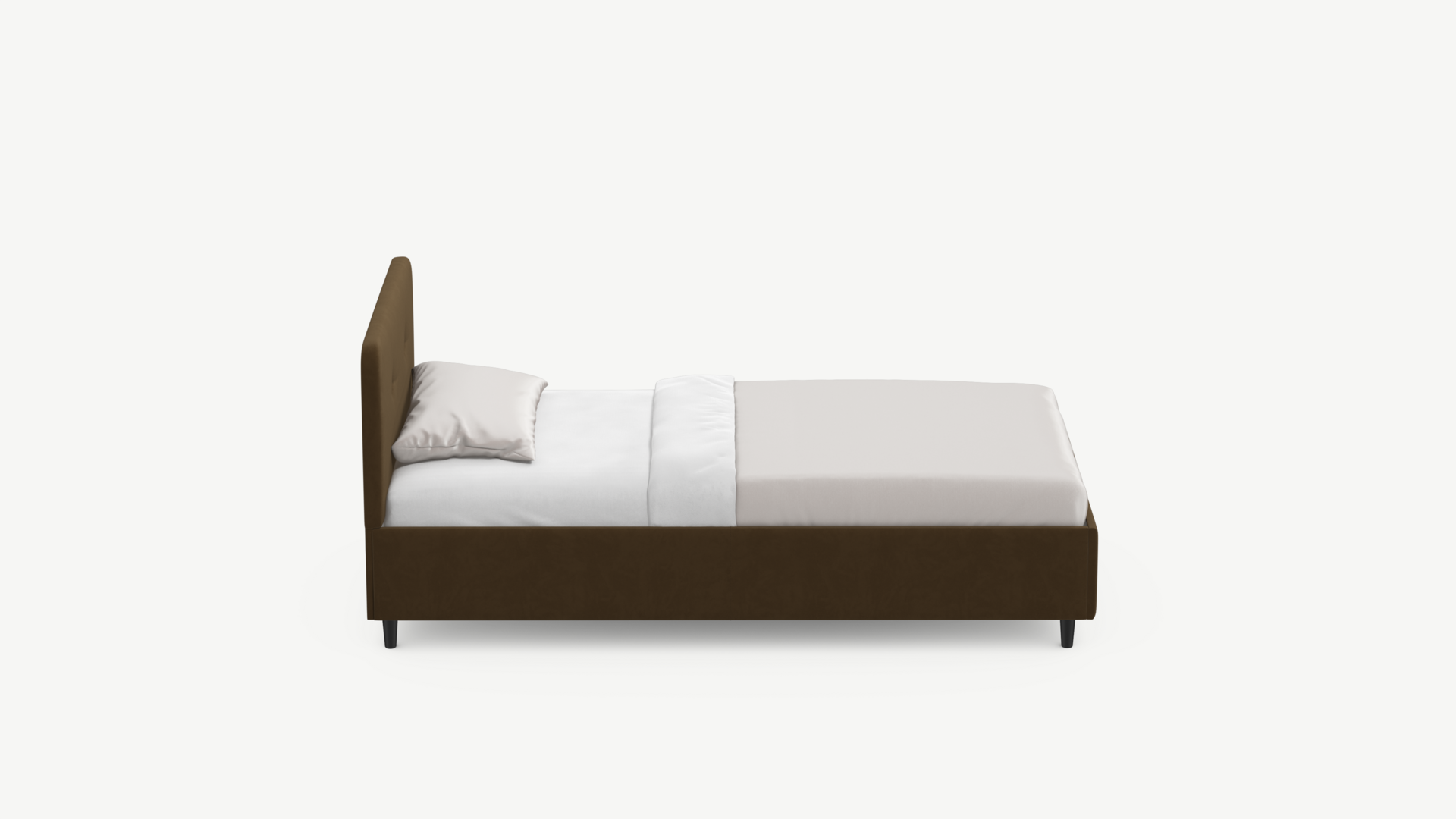 Царга, задающая пропорции, благодаря гладкости своей фактуры подчеркивает центральный элемент декора. Высокие опоры приподнимают фигуру кровати над полом и добавляют её образу визуальной легкости.