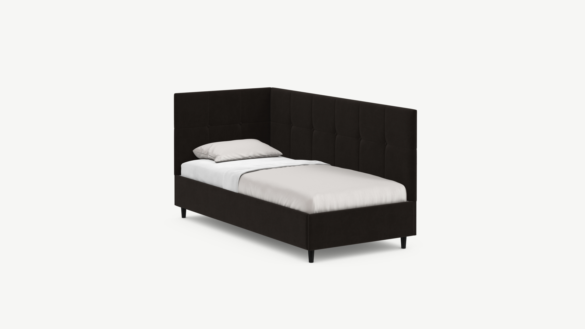 Угловая односпальная кровать MOON FAMILY 1261 с мягкой спинкой и изголовьем создаст в Вашей спальне ощущение уюта. Крупная квадратная стежка привносит в интерьер графических акцентов, а вставка из пуговиц наполняет пространство ощущением домашнего тепла.