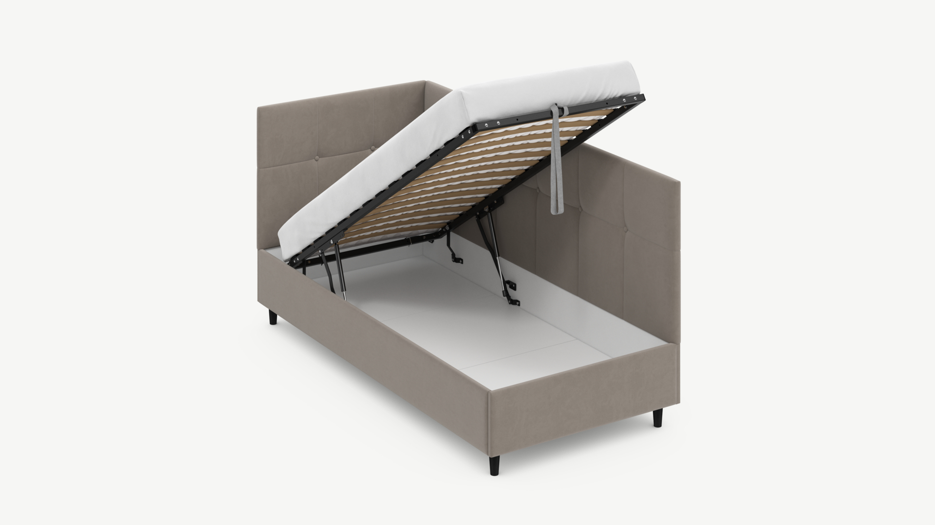 • Регулируемый подъемный механизм имеет два положения установки газовых амортизаторов в зависимости от веса матраса. Это дает возможность оптимально подстраивать угол подъема основания, а также плавно и бесшумно поднимать и опускать спальное место.