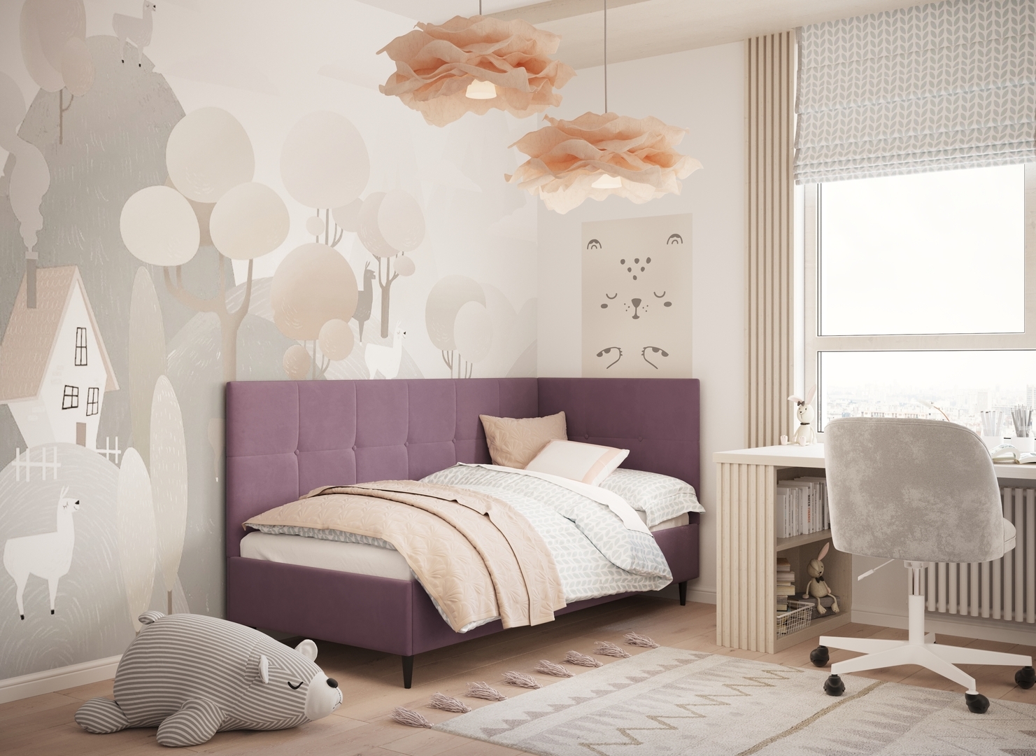 Угловая односпальная кровать MOON FAMILY 1261 с мягкой спинкой и изголовьем создаст в Вашей спальне ощущение уюта. Крупная квадратная стежка привносит в интерьер графических акцентов, а вставка из пуговиц наполняет пространство ощущением домашнего тепла.