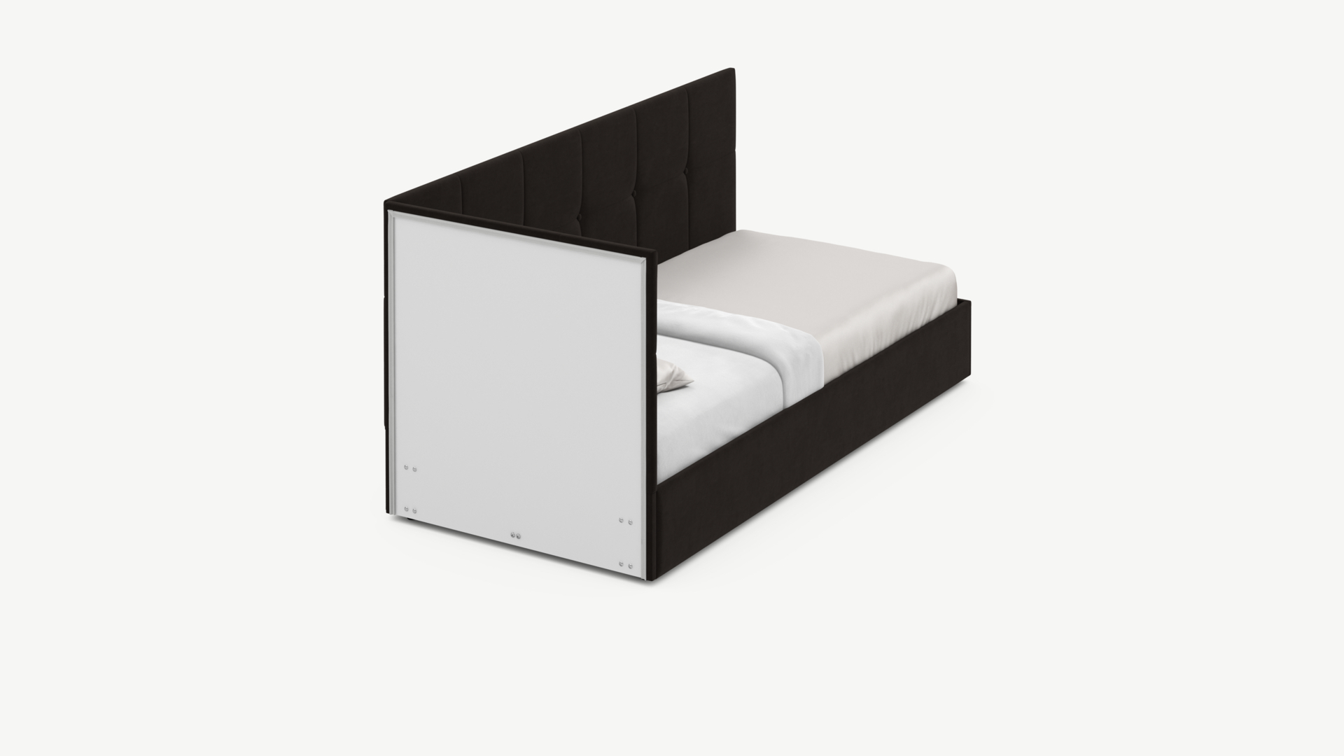 Угловая односпальная кровать MOON FAMILY 1261 с мягкой спинкой и изголовьем создаст в Вашей спальне ощущение уюта. Крупная квадратная стежка привносит в интерьер графических акцентов, а вставка из пуговиц наполняет пространство ощущением домашнего тепла.