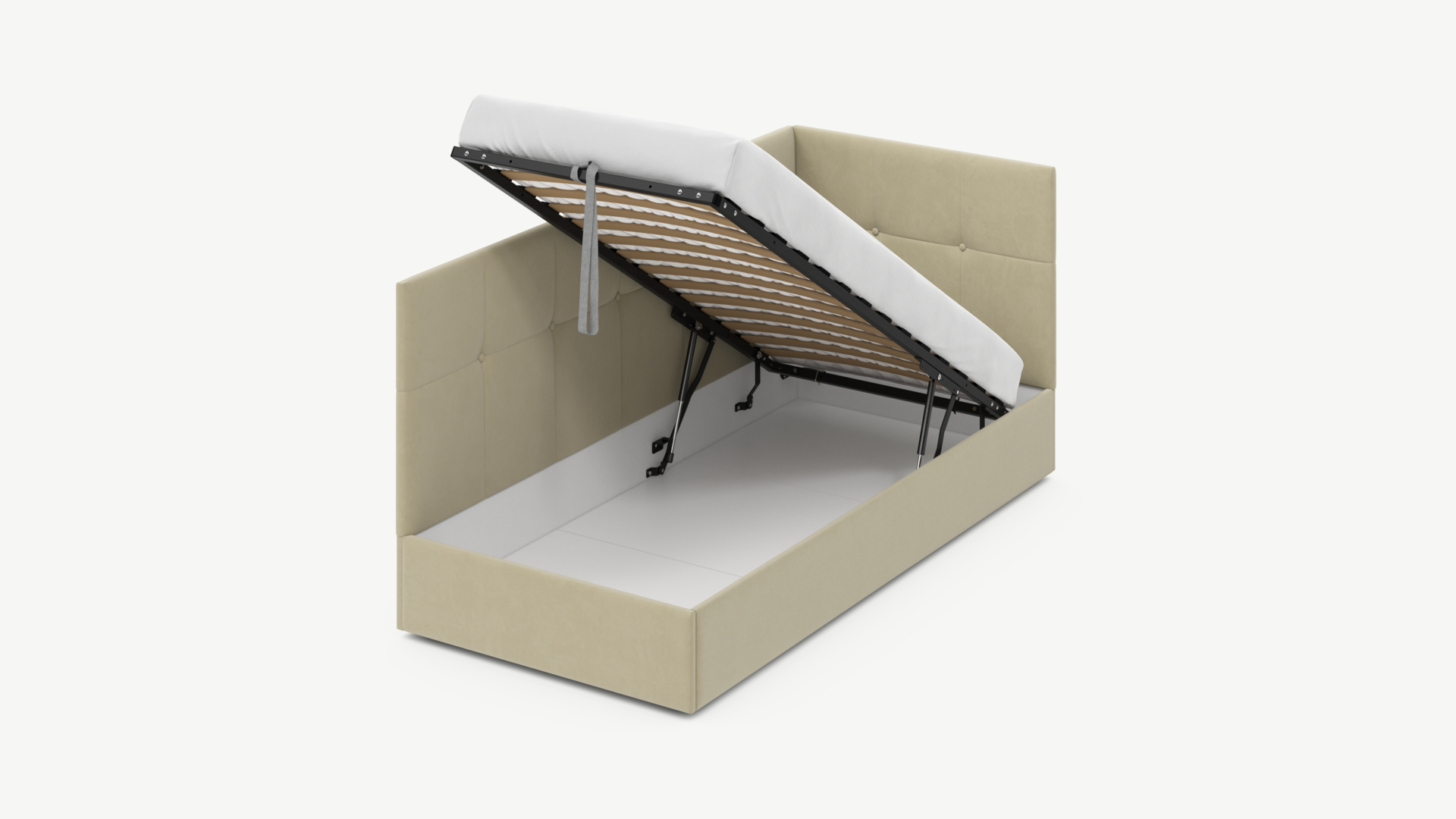• Регулируемый подъемный механизм имеет два положения установки газовых амортизаторов в зависимости от веса матраса. Это дает возможность оптимально подстраивать угол подъема основания, а также плавно и бесшумно поднимать и опускать спальное место.