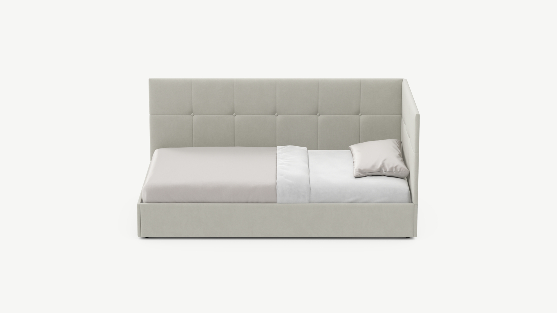 Угловая односпальная кровать MOON FAMILY 1261 с мягкой спинкой и изголовьем создаст в Вашей спальне ощущение уюта. Крупная квадратная стежка привносит в интерьер графических акцентов, а вставка из пуговиц наполняет пространство ощущением домашнего тепла.