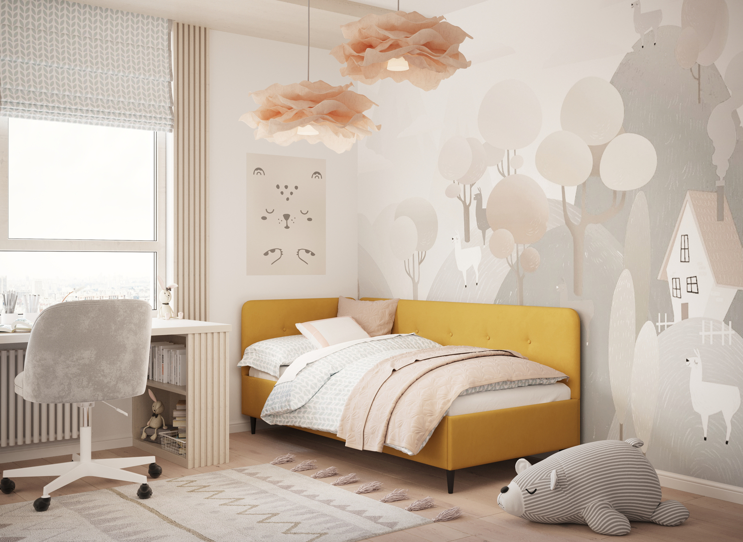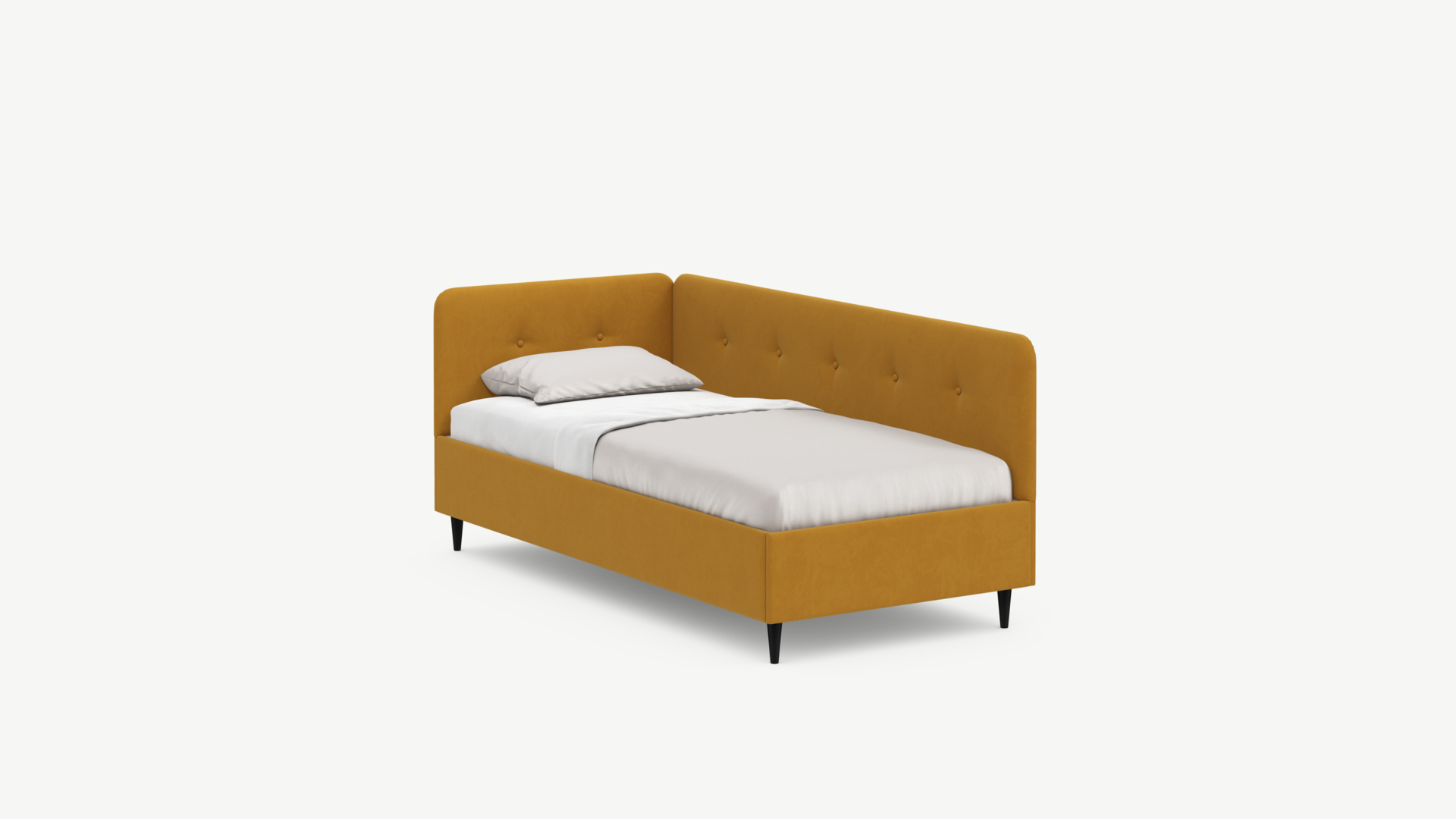 Угловая односпальная кровать MOON FAMILY 1253 с мягкой спинкой и изголовьем обладает округлыми формами, привносящими в интерьер нотки нежности. Изголовье, украшенное пуговицами, добавляет окружающему пространству шарм и уют. Высокие опоры придают кровати визуальной легкости, а также обеспечивают удобство во время уборки.