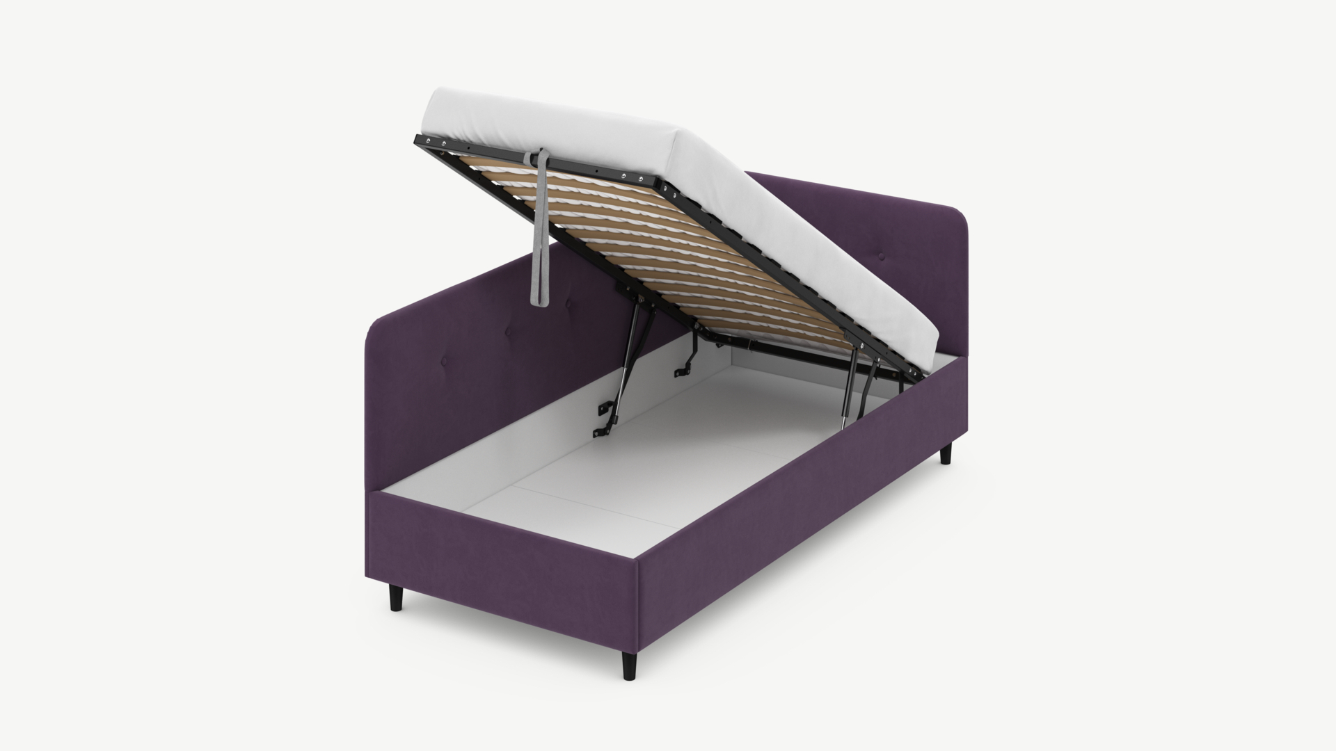 • Скрытая под основанием вместительная емкость без внутренних перегородок позволяет использовать всю площадь подкроватного пространства для хранения вещей.
