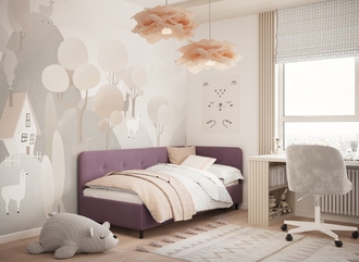 Угловая односпальная кровать MOON FAMILY 1253 с мягкой спинкой и изголовьем обладает округлыми формами, привносящими в интерьер нотки нежности. Изголовье, украшенное пуговицами, добавляет окружающему пространству шарм и уют. Высокие опоры придают кровати визуальной легкости, а также обеспечивают удобство во время уборки.