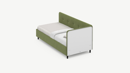Угловая односпальная кровать MOON FAMILY 1253 с мягкой спинкой и изголовьем обладает округлыми формами, привносящими в интерьер нотки нежности. Изголовье, украшенное пуговицами, добавляет окружающему пространству шарм и уют. Высокие опоры придают кровати визуальной легкости, а также обеспечивают удобство во время уборки.